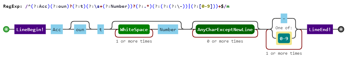 I need a regex which checks each line starting with “Acc”, ignore white space and any special character and then ending with numeric.